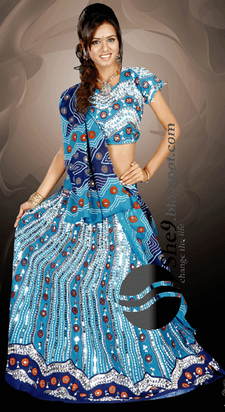 Elegant style of Indian Lehnega Choli with sparking and dark colors. This dress is decorated with sparking motif and mirrors. These types of lehenga are used in evening parties, Mehndi parties & Diwali parties also in Indian villages.